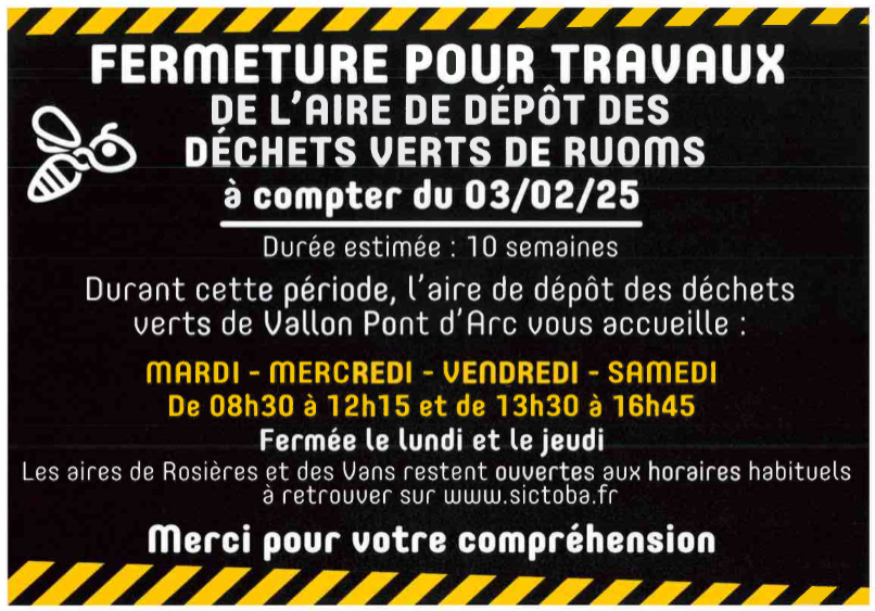 Le SICTOBA tient à vous informer qu’à compter du lundi 3 février 2025, l’aire de dépôt des déchets verts de Ruoms sera temporairement fermée pour une durée estimée de 10 semaines.