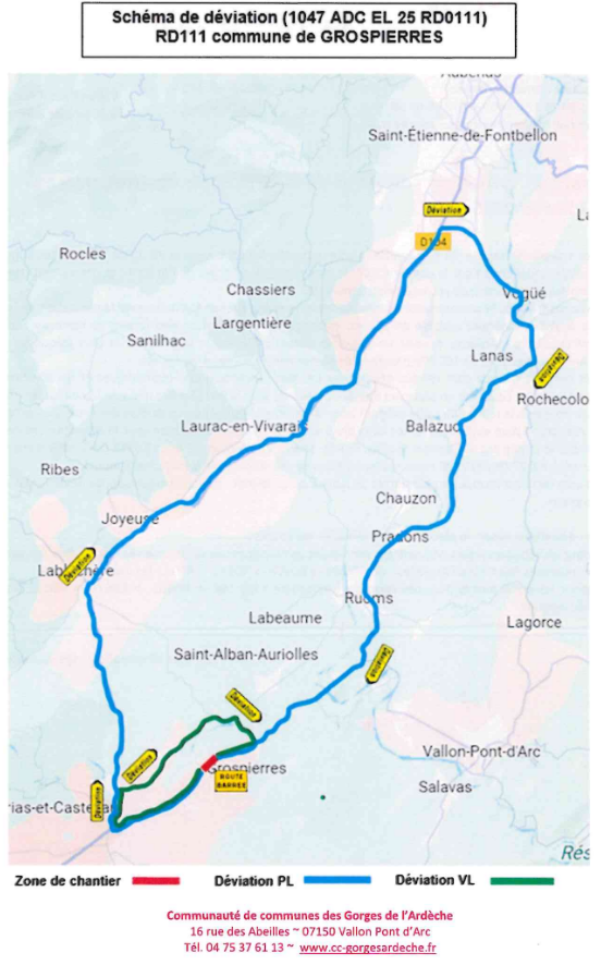 - pour les véhicules légers (VL), entre le rond-point de Maisonneuve et Grospierres-Gare, déviation par Chandolas et Saint-Alban-Auriolles : via RD 104 -> RD208 -> RD246 -> RD111 (et inversement),
