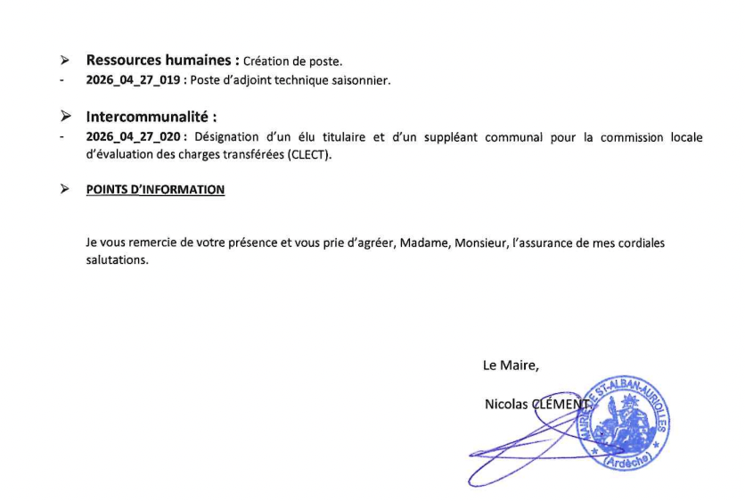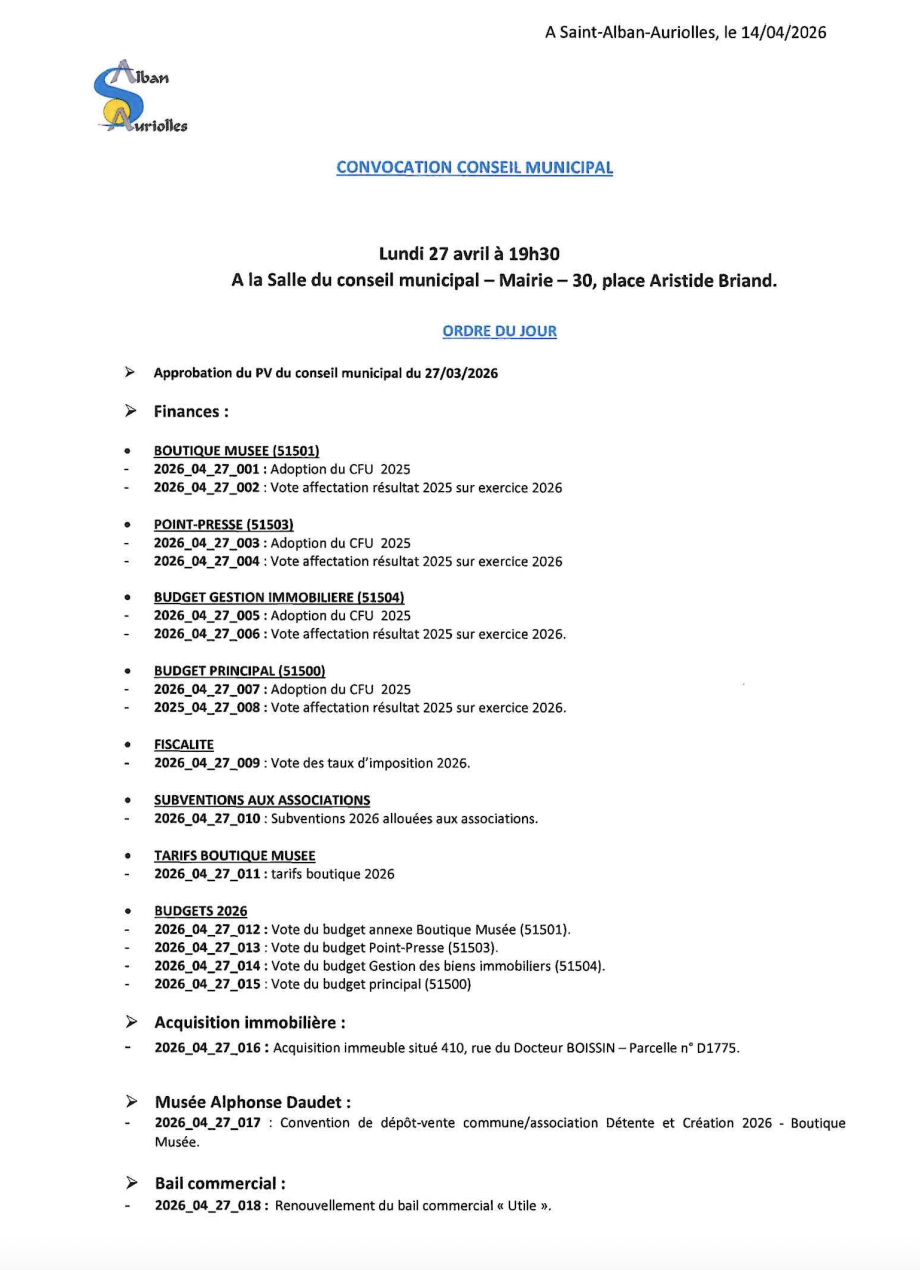 Ordre du jour du conseil municipal du 27 Avril 2026